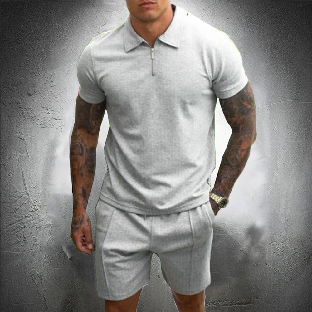 Name: Conjunto de 2 piezas para hombre, ropa de moda, chándal para trotar, traje con cuello levantado y pantalones cortos de tela de algodón, ajustado, verano, 2021